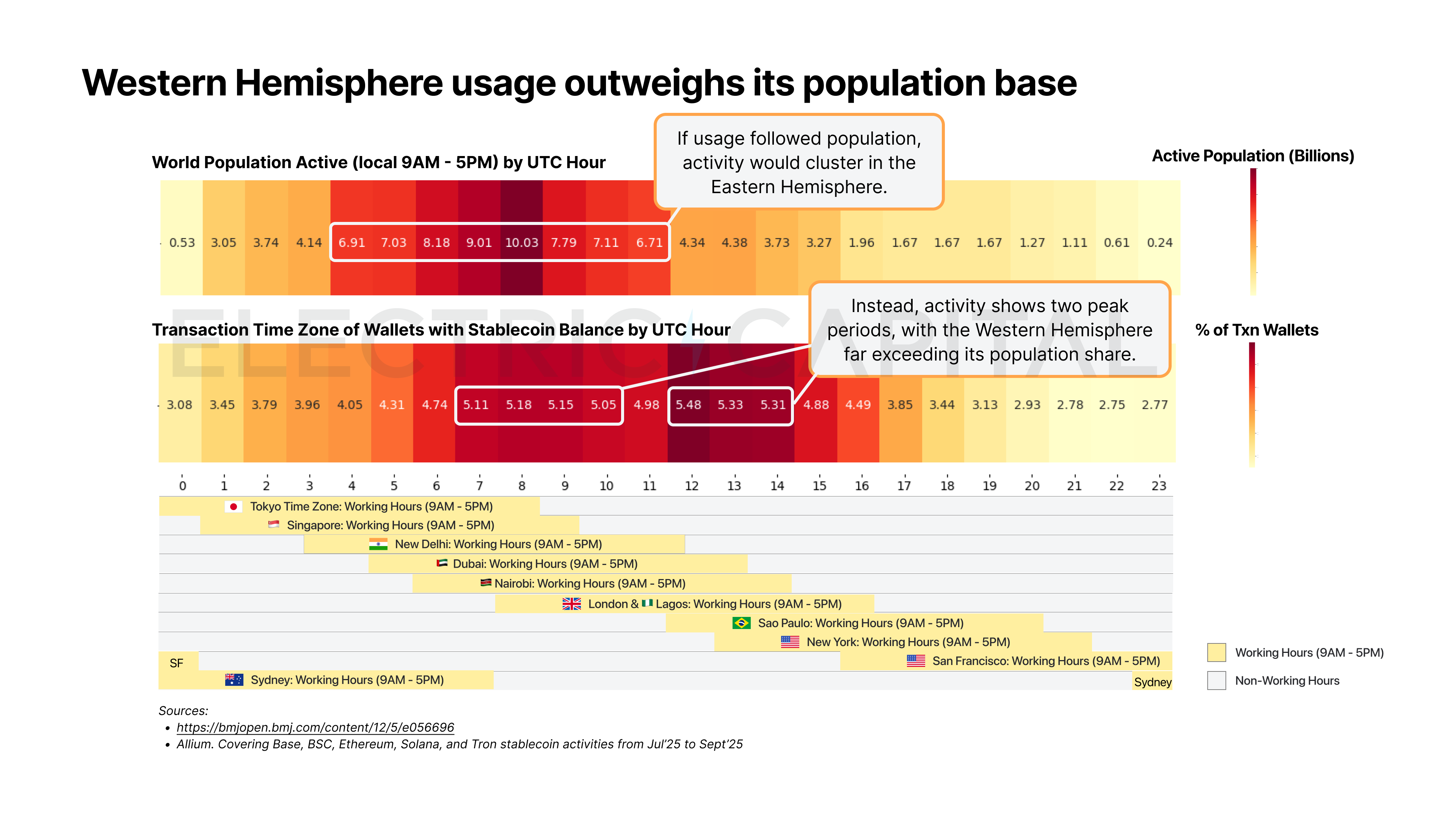 Instead, the peak at UTC 12 reveals the Western Hemisphere’s outsized influence: despite having a smaller population base, the Americas generate stablecoin activity exceeding more populous regions.