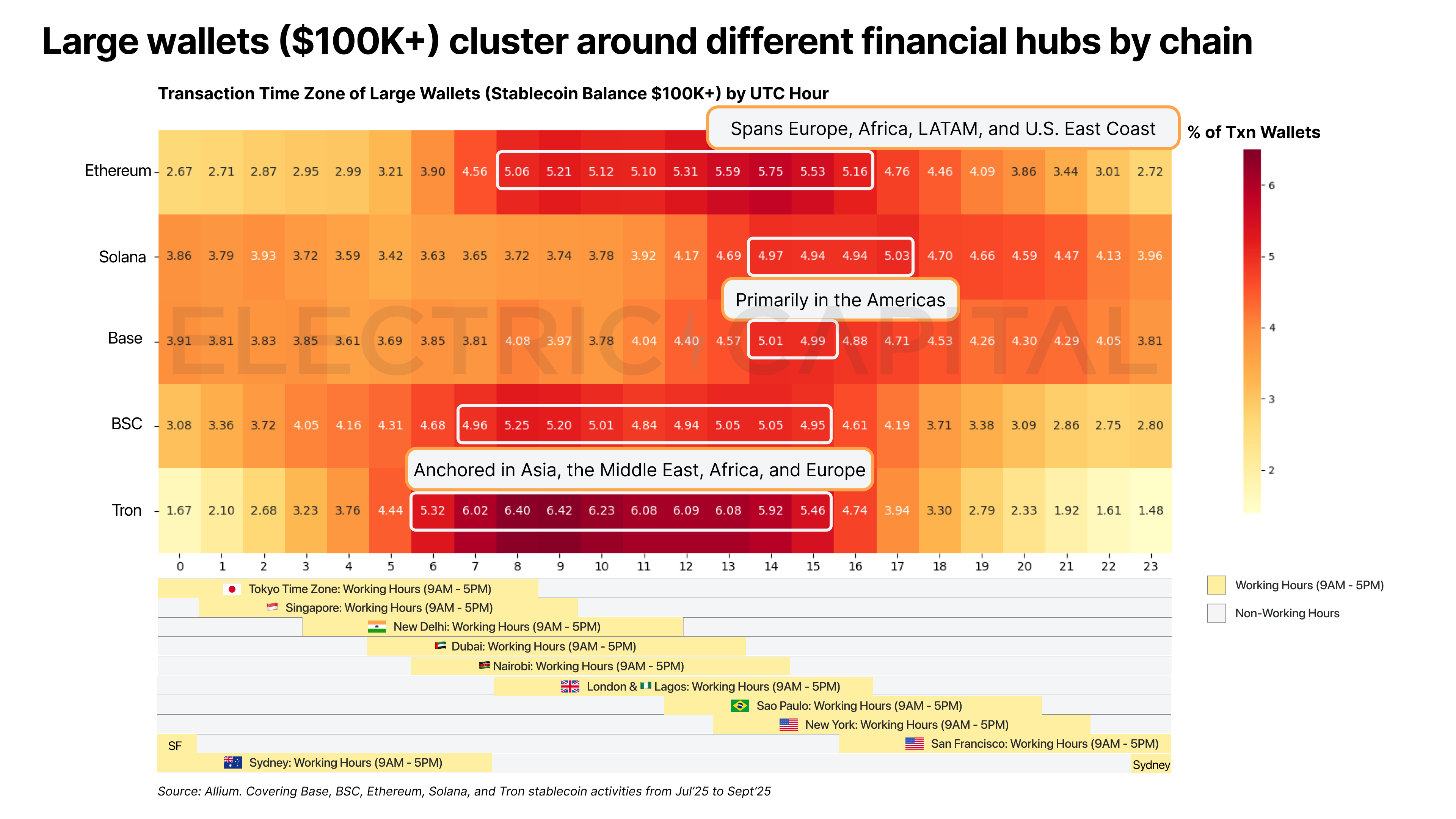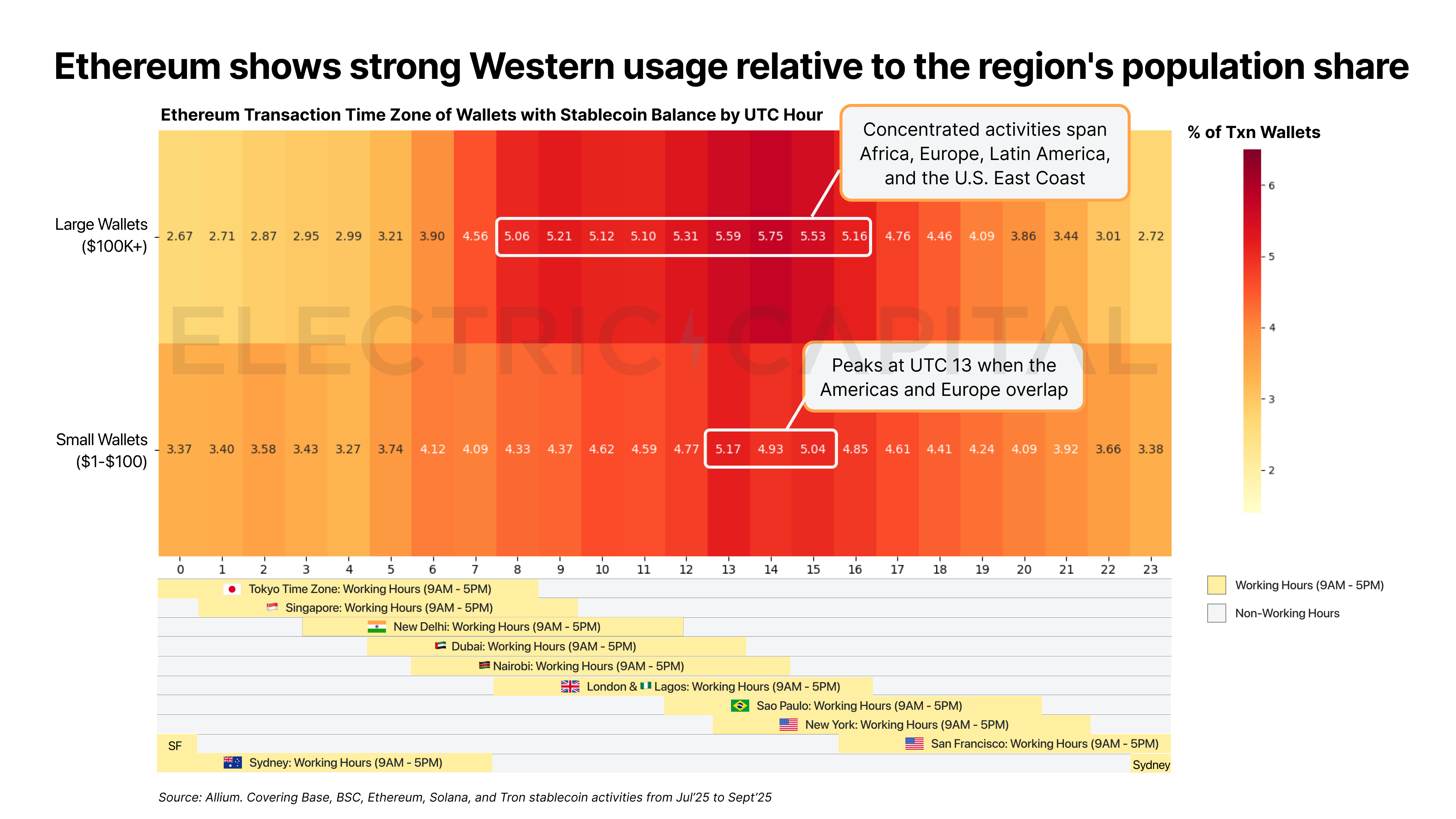 Large wallets ($100K+): Activity begins at UTC 13 as the U.S. East Coast and Latin America come online, with strong continued engagement through UTC 16. The U.S. West Coast shows the highest per-capita usage of any region globally.