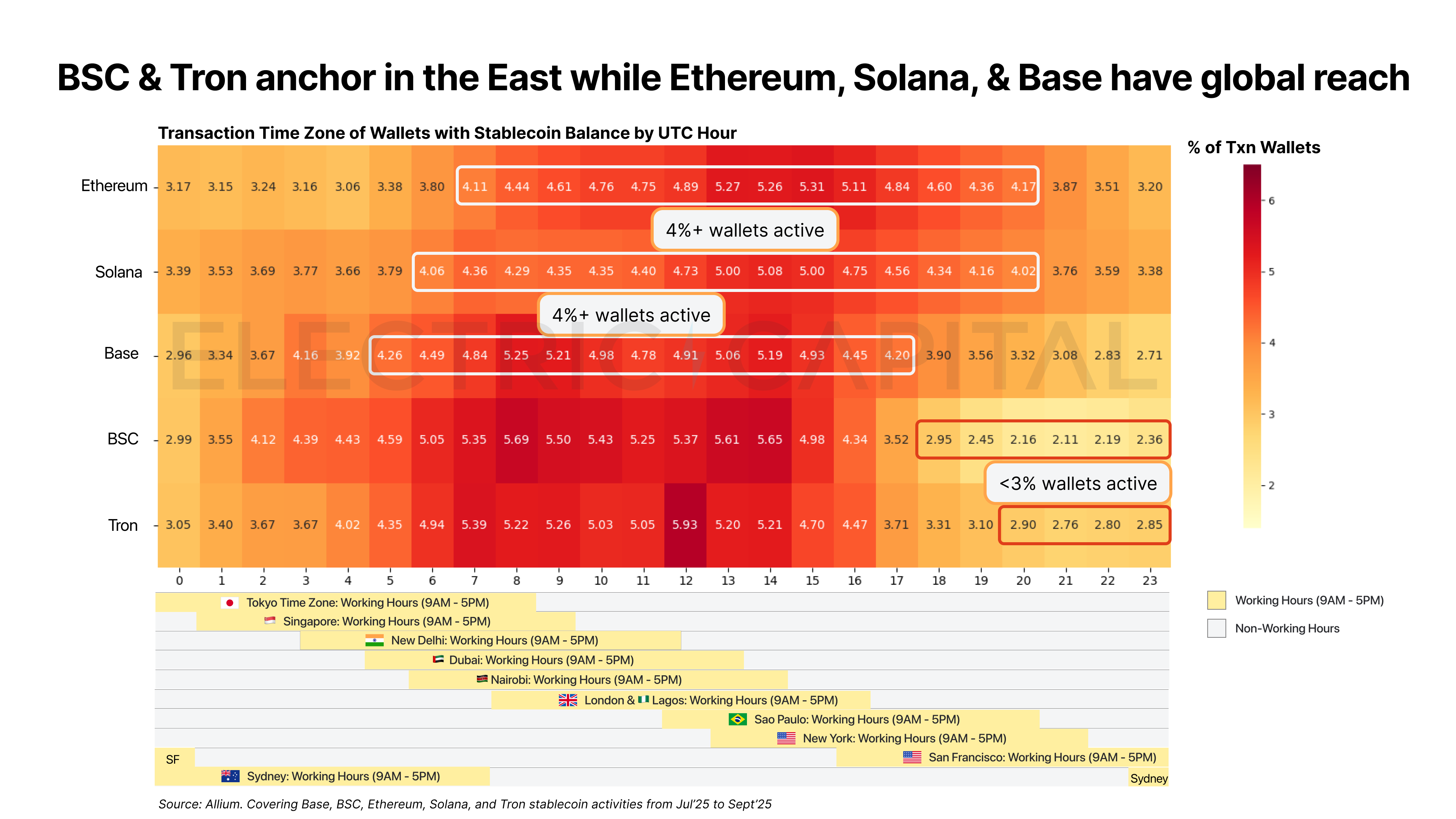 Different chains serve different geographies. BSC and Tron are heavily concentrated in Asian, Middle Eastern, and African markets, with minimal Western activity (<3% activity during Western working hours). Ethereum, Solana, and Base show broader geographic reach than BSC and Tron, with active participation spanning multiple time zones.