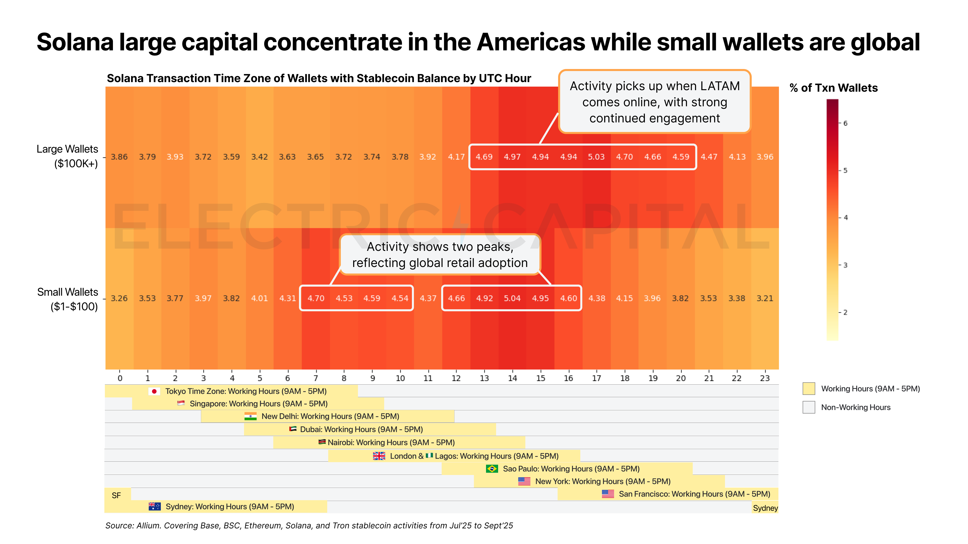 Solana shows geographic separation between large and small wallets: large capital concentrates in the Americas while small wallet users are globally distributed.