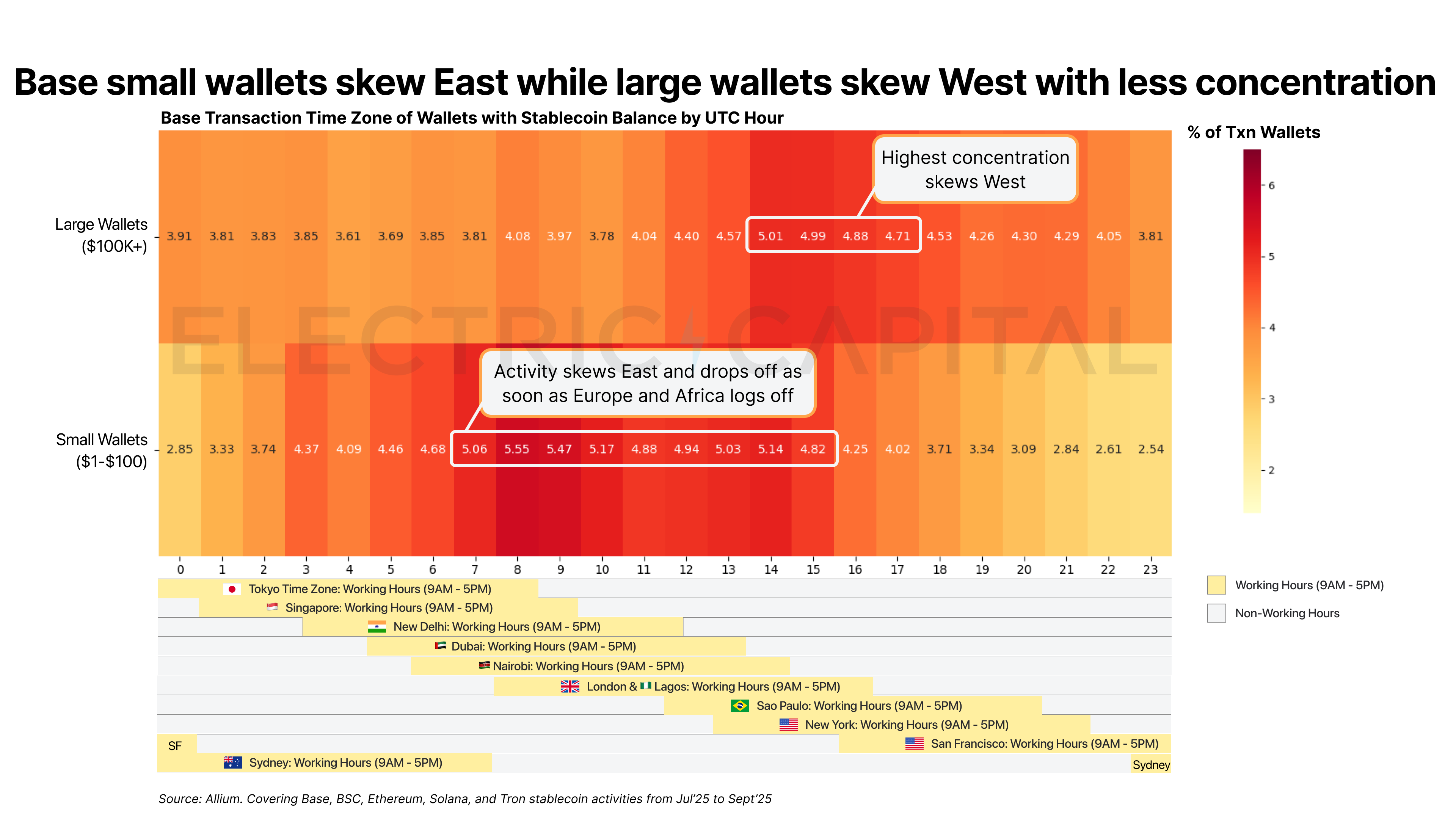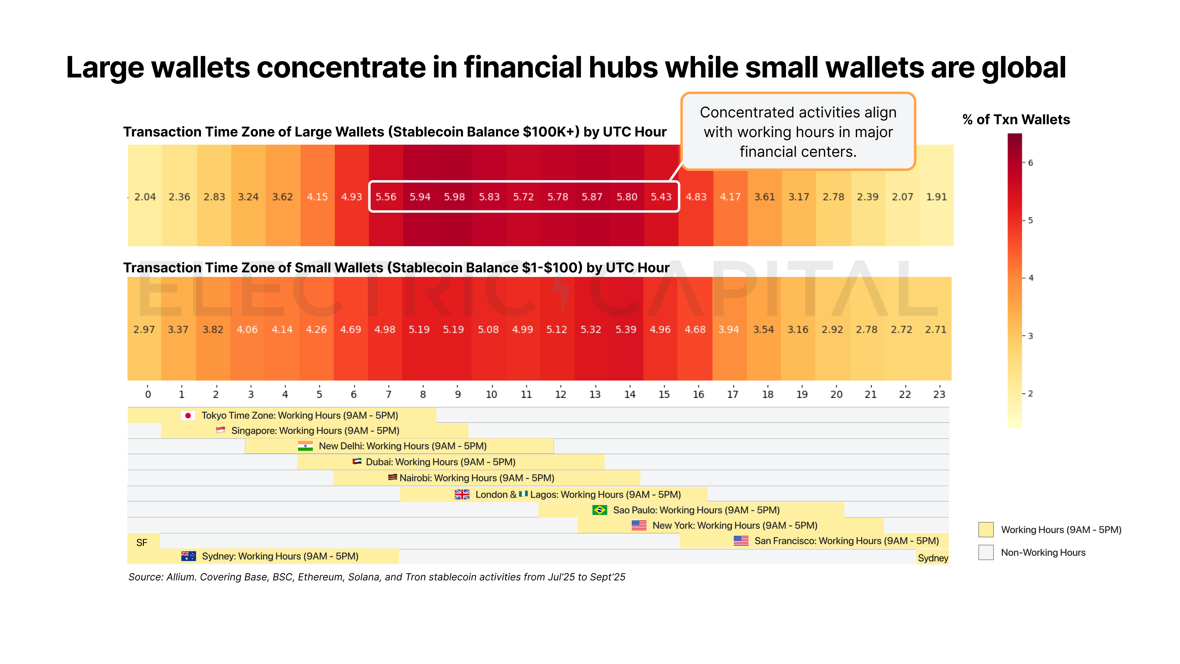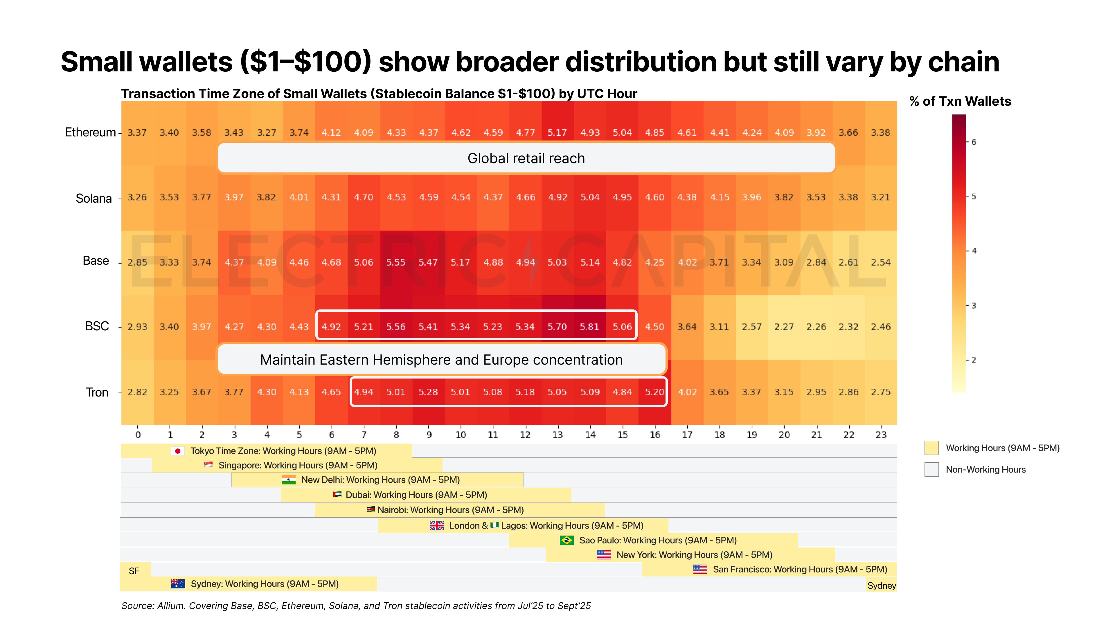 Small wallets ($1–$100): Activity peaks at UTC 13 when the Americas and Europe overlap. Despite the Western Hemisphere’s smaller population, per-capita usage rates significantly exceed other regions.