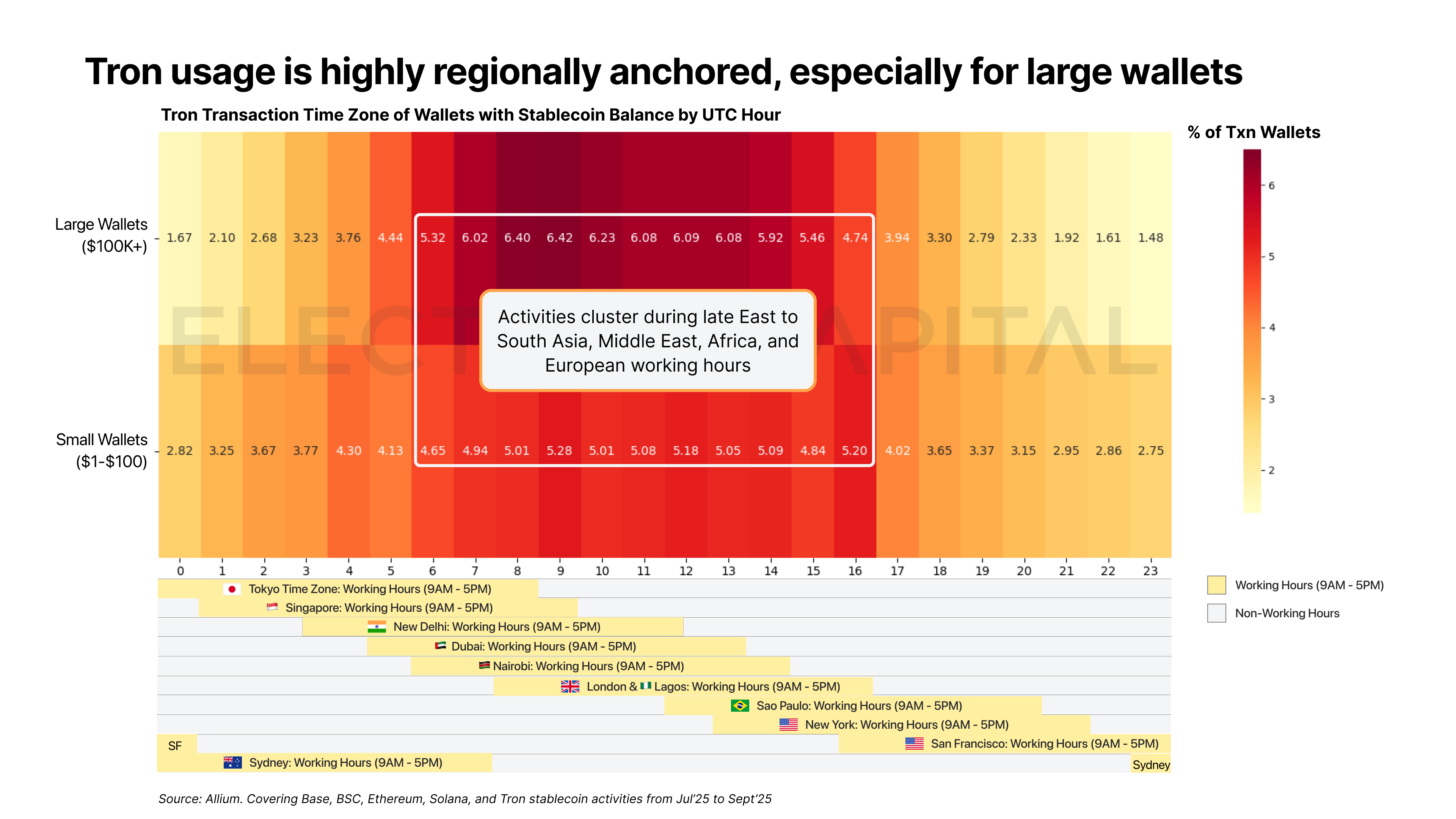 Large wallets ($100K+): Activity concentrates between UTC 8–16, with peak engagement spanning Africa, Europe, Latin America, and the U.S. East Coast.