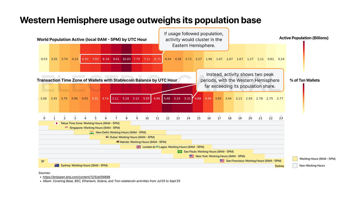 Stablecoin activity is not confined to a single geography. Instead, usage spreads across time zones, with two distinct peaks: