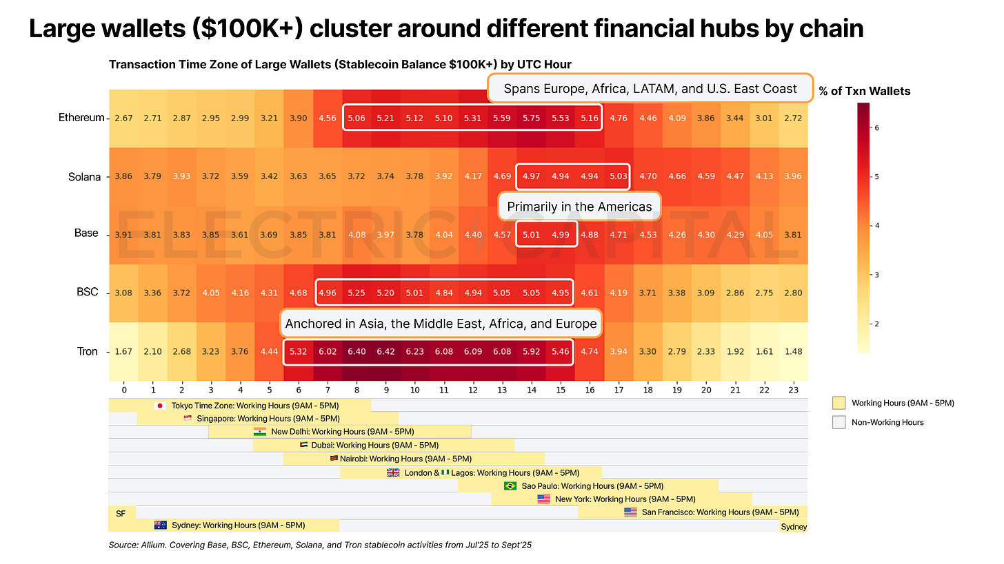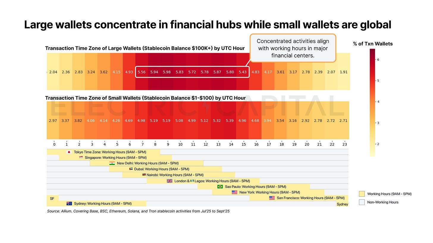 Large wallets ($100K+): Activity concentrates between UTC 8–16, with peak engagement spanning Africa, Europe, Latin America, and the U.S. East Coast.