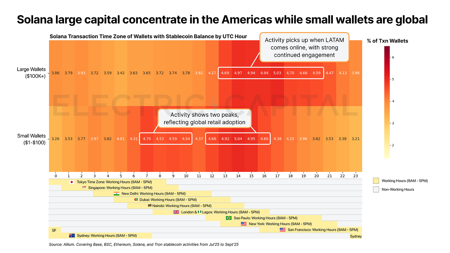 Solana shows geographic separation between large and small wallets: large capital concentrates in the Americas while small wallet users are globally distributed.