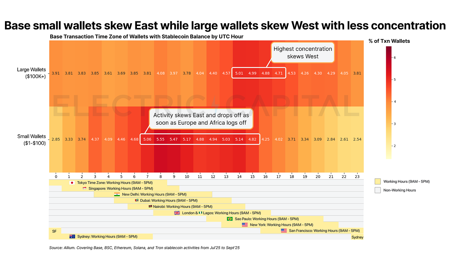 Small wallets ($1–$100): Activity peaks at UTC 13 when the Americas and Europe overlap. Despite the Western Hemisphere’s smaller population, per-capita usage rates significantly exceed other regions.
