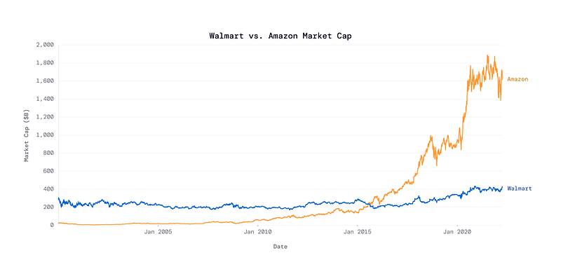 Walmart was the original retail giant; Amazon is now worth 3x as much