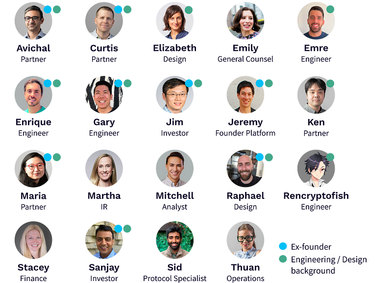 Electric Capital’s org chart reflects our software-first approach. Over 60% of our team has a background in engineering, while 50% of our team members are former founders. We have two designers on staff, and our investment partners still write code.