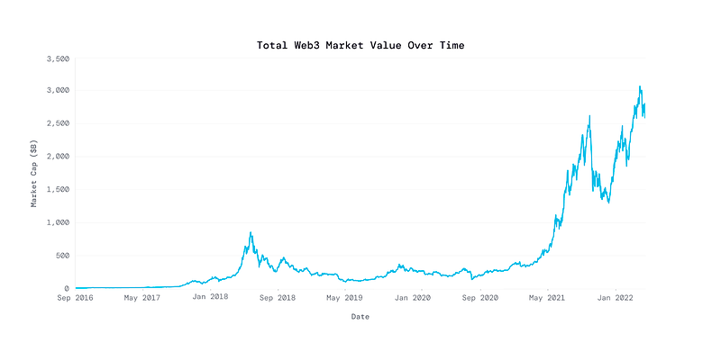 Since then, the crypto market has grown to $2 trillion, the market cap of stablecoins has grown to over $180 billion, and the total value locked in DeFi protocols has grown to over $100 billion. These permissionless protocols for value transfer will eventually outcompete their traditional counterparts because they are composable, permissionless, global, and available 24/7. Eventually crypto will eat all forms of money movement and most capital markets.